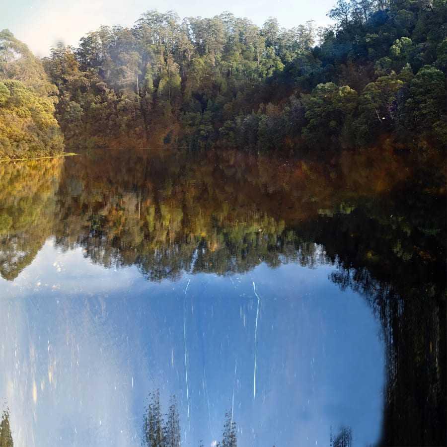 Through these means, he explores the mystery and spiritual presence of this remarkable river. He works with the uncanny light that reflects off brackish darkness—low morning and evening light, stronger or diffuse illumination across the Tarkine, and the deep shadows that sometimes render the landscape almost colourless.
