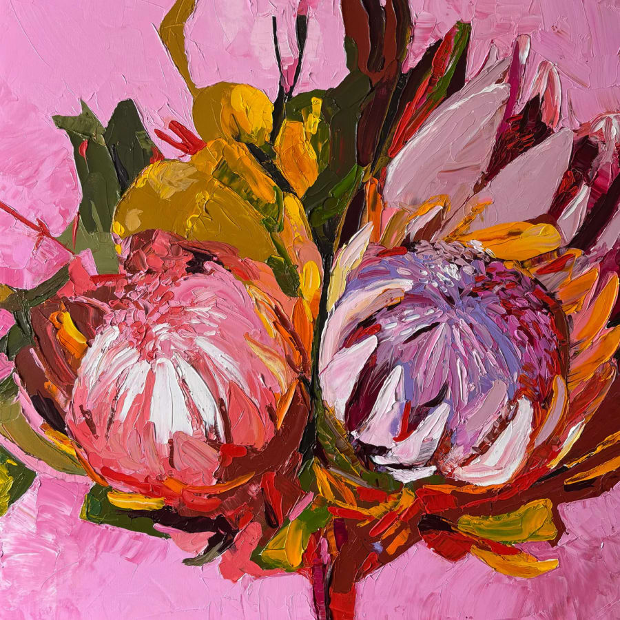 Flourish, a vibrant, textural exploration of nature’s emotional and symbolic language through floral forms. Each painting celebrates the resilience, delicacy, and vitality of flowers rendered in impasto technique, where thick layers of acrylic paint build tactile surfaces that invite viewers to engage not only visually, but almost physically with colour, form, and texture.