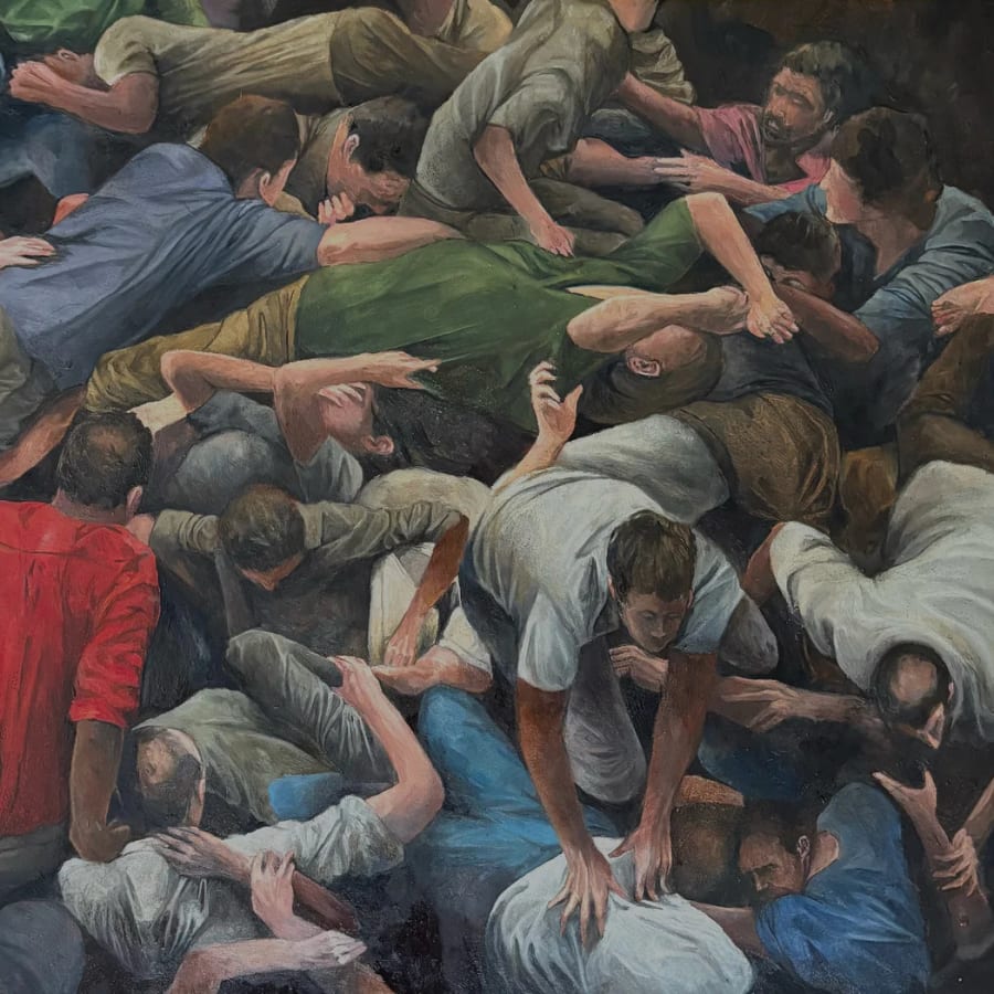 Samuel O’Malley returns to Brunswick Street Gallery with Knocking From Below, a new series exploring the quiet pressures and hidden tensions beneath daily life. While his earlier works looked to crowded bodies, political clashes and scenes of work, these paintings turn inward, finding a softer but still an insistent kind of disturbance.
