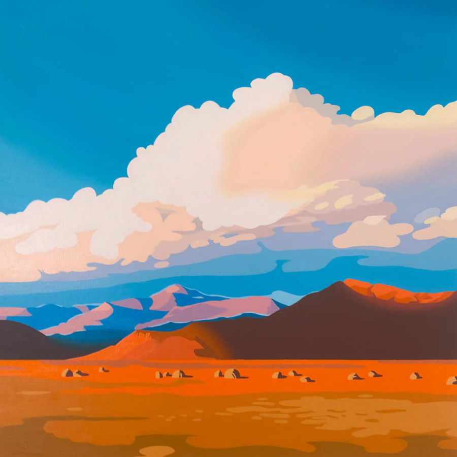The work is a seamless concinnity of colour and biomorphic form. Each painting venerates traditional landscape while learning from it and expanding into directions that are delicate, mysterious and ethereal. Soft, light gradients fructify contoured, sleek shapes—evoking the peak moment of a hike when clarity arrives, the epiphany that emerges as breath settles: hush and serene, you realise you are exactly where you are meant to be.